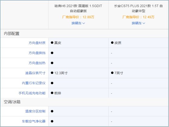 实际上,程冬此前没少做功课,很多热门车型都试驾过,但仅是外观、内饰这里两部分,除了哈弗H6国潮版就没有让他满意的。就拿长安CS75 PLUS(1.5T豪华型,官方指导价12.49万)来说,它的外观设计的确出色,可以凸显男性凶悍气势,但是内饰部分的豪华感比不上哈弗H6国潮版,前排座椅最多6向调节,且座椅过于柔软,久坐易累;空气防护不够全面,未配备等离子空气净化器;也未配备手机无线充电。