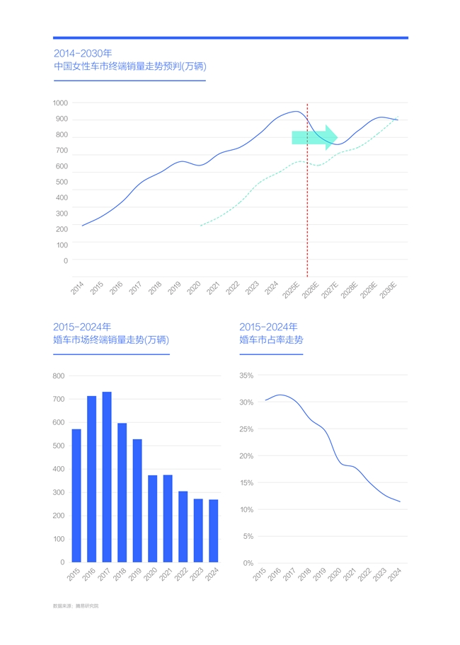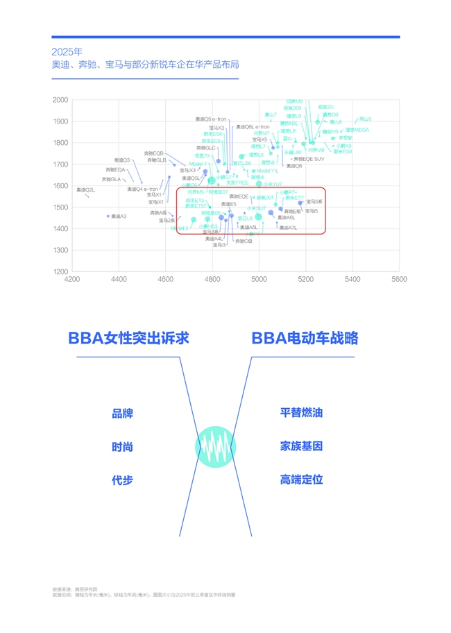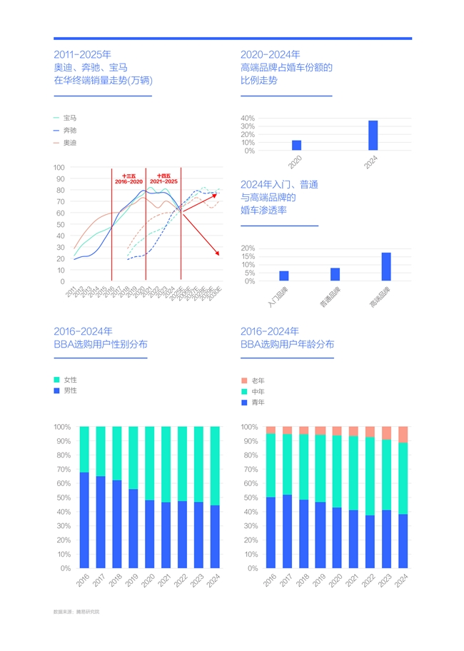 十四五期间BBA之所以能避免销量崩盘,主要是女性与结婚两拨用户为品牌力突出的BBA创造了新机遇:近十年,中国女性车市持续扩大,2024年终端销量突破900万辆,市占率逼近40%。女性以家庭增购为主,且女性更注重品牌,便于品牌力突出的BBA更好抓住女性机遇;近十年,中国社会的结婚购车持续升级,2020-2024年高端品牌在婚车市场的市占率由不足12%飙升至36%,代表品牌BBA成为最大受益者,2024年奔驰位居高端品牌婚车销量排行榜首,奥迪位居第二,宝马位居第四,同时结婚用户对BBA的销量贡献均突破20%;