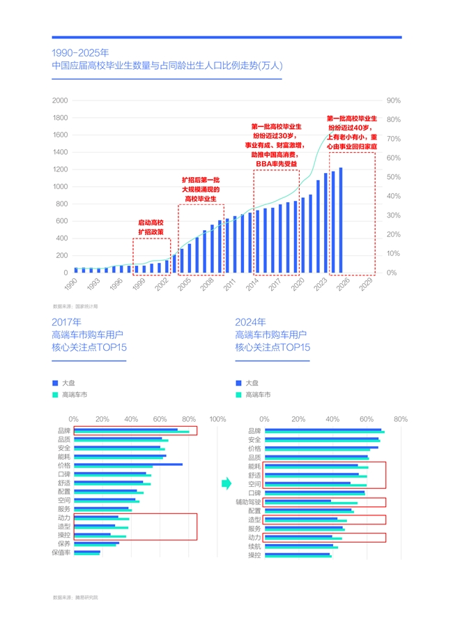 造就上述奇观的核心推手就是20世纪末与21世纪初由中国政府主导的轰轰烈烈的高校改革(扩招),当时主要目的是缓解中国经济快速发展中的人才瓶颈挑战。2003年起,中国社会快速涌现第一批大规模扩招后的高校毕业生,他们正好赶上了中国加入WTO后对外贸易蓬勃发展与国内互联网经济快速崛起等诸多发展机遇,他们也不负众望,快速成为新时代的弄潮儿。经过十年左右摸爬滚打的第一批扩招生,从2013年起陆续迈过30岁,完成结婚生子,组建起小家庭,也积累了不少家庭财富,进入十三五后,他们掀起了买买买浪潮,尤其是高端奢侈品。在具体购车层面,高端品牌典型代表的BBA,成为第一批高校扩招生买买买浪潮的最大受益者,BBA不仅能更满足青年男性对动力、操控等性能的要求,强大的品牌力也能帮助事业有成的青年用户得到社会更好的认可。在高端车市的关注点排行中,虽然动力、操控相对靠后,但它们对比大盘都比较突出,这种差异性容易成为产品的独特卖点,更好吸引用户;