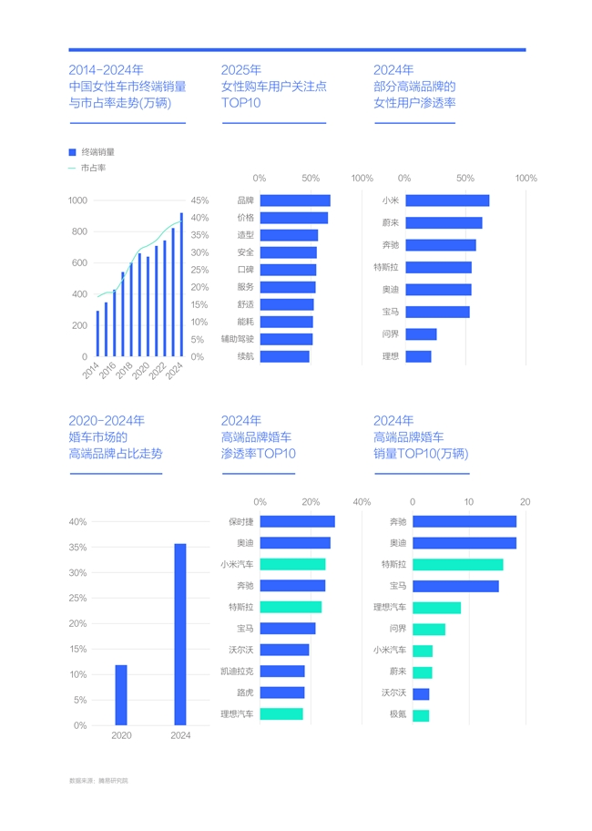 面对十三五那波以优质青年家庭为主的新机遇,BBA是最大受益者,没有之一,狼吞虎咽饱餐了一顿,雷克萨斯、沃尔沃等第二阵营也就喝点汤。但面对十四五的女性与结婚这两大新机遇,BBA只能算主要受益者之一,特斯拉、小米等城市代步型新锐高端品牌也纷纷受益:2024年,奔驰、奥迪、宝马的女性购车占比纷纷突破50%,但小米逼近70%,蔚来突破60%,特斯拉50%多,哪怕问界、理想也有20%多,也能在女性车市分一杯羹;2024年,虽然奔驰、奥迪与宝马分别位居高端品牌婚车销量TOP4,但TOP10中,新锐高端品牌占了六席,其中特斯拉位居第三,与BBA不相上下。