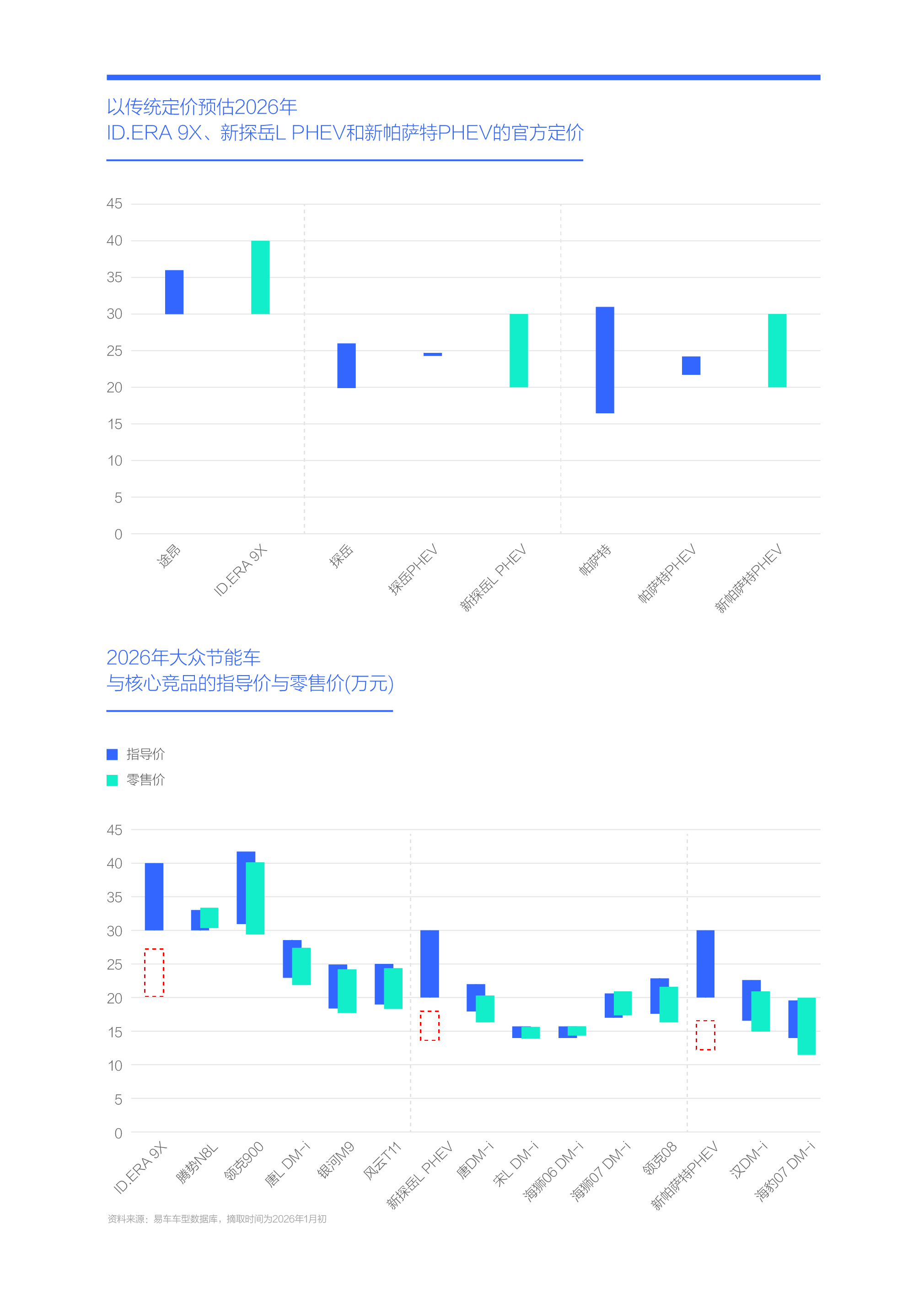 2026年起,大众会发动新一轮节能车攻势,本轮攻势任重道远,定价成了重中之重的事情。如果按照节能车高于同级别燃油车的传统标准定价,基于途昂官方核心价区30~35万元推算,大众的大型增程SUV ID.ERA 9X大体得定价30~40万元,同理,新探岳L PHEV和新帕萨特大体也得定价20万元以上;