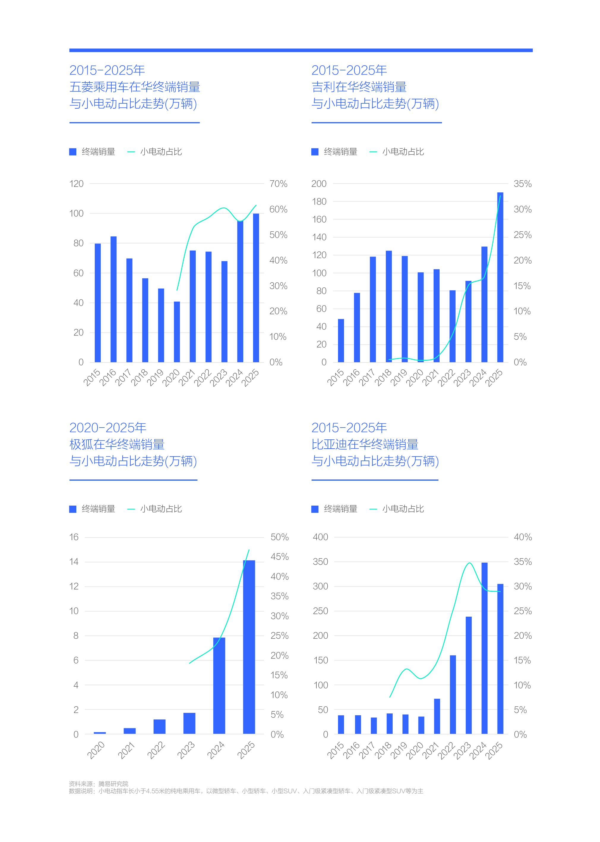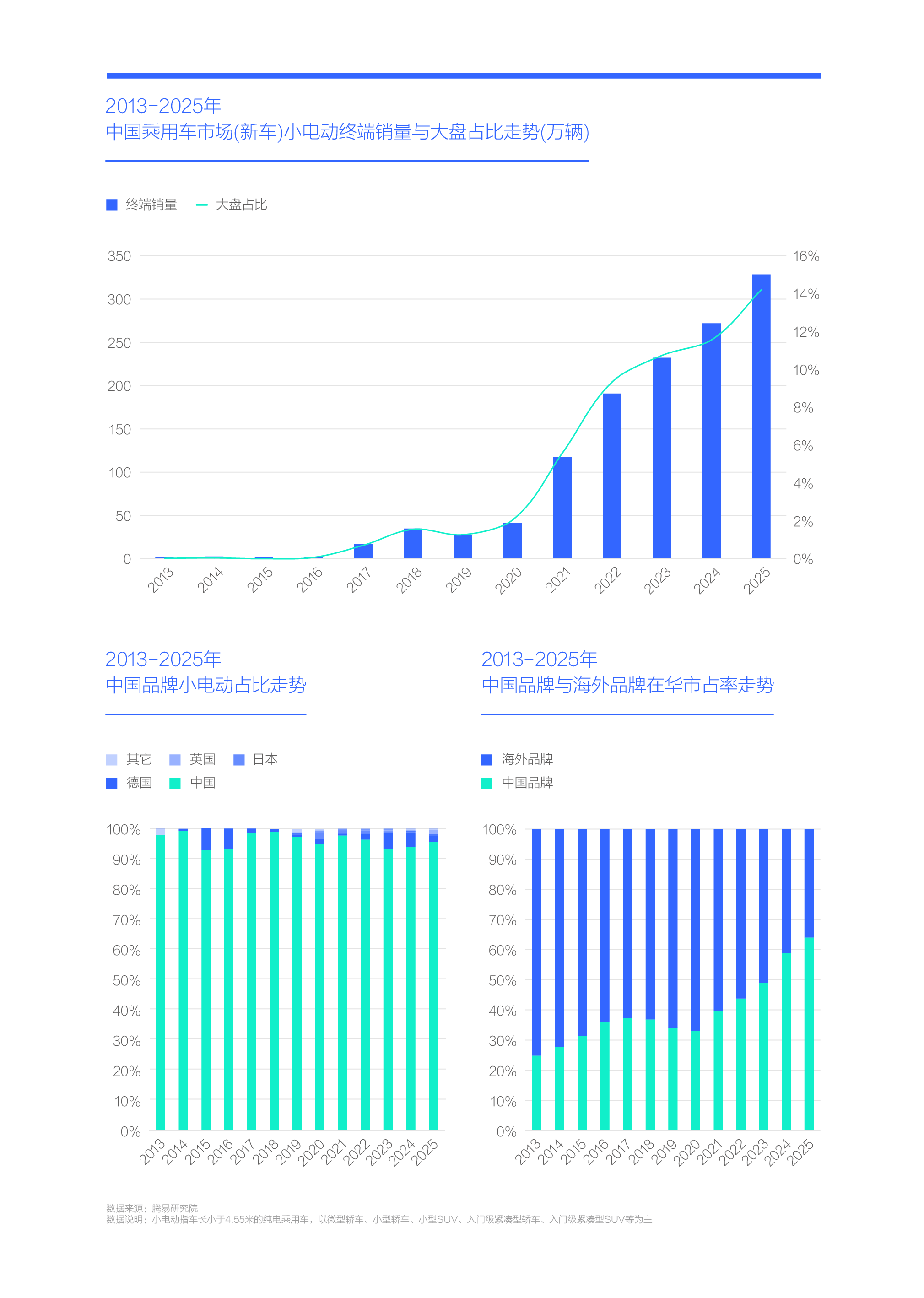 2020-2025年,中国车市的小电动销量从不足50万辆飙升至300多万辆,中国品牌占比近96%,几乎是唯一受益者