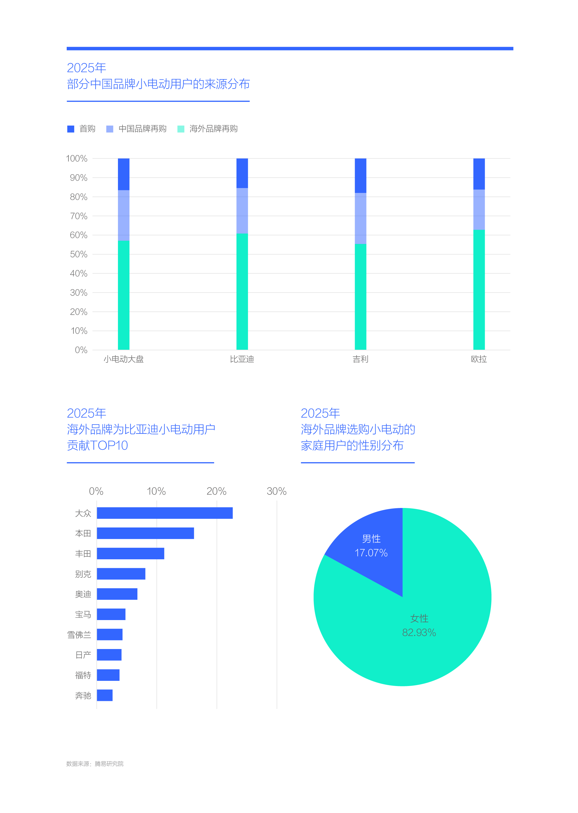选购小电动的海外品牌中,大众贡献最大,2025年占比22.64%,其次是本田和丰田,超过10%,再次是别克和奥迪,超过5%,BBA都位列TOP10。我们经常能听到有关问界、蔚来、理想等中国新锐高端品牌有多少用户来自BBA之类的宣传报道,其实小电动也吸引了不少优质用户,蔚来汽车的小电动品牌萤火虫,就吸引了大量BBA的老用户;
